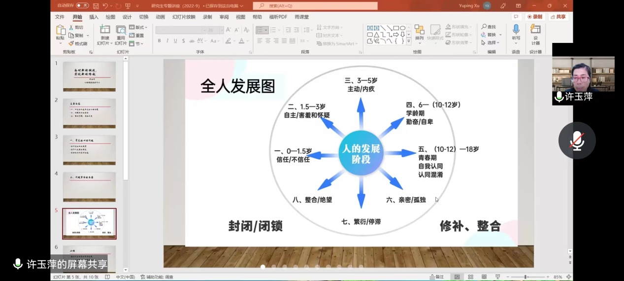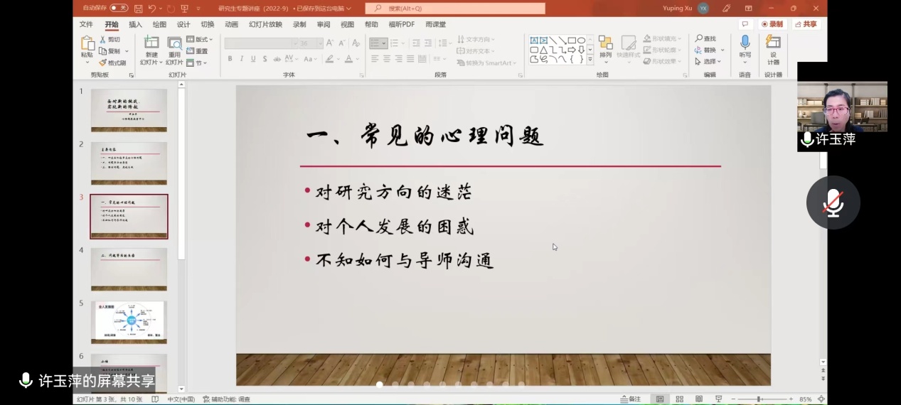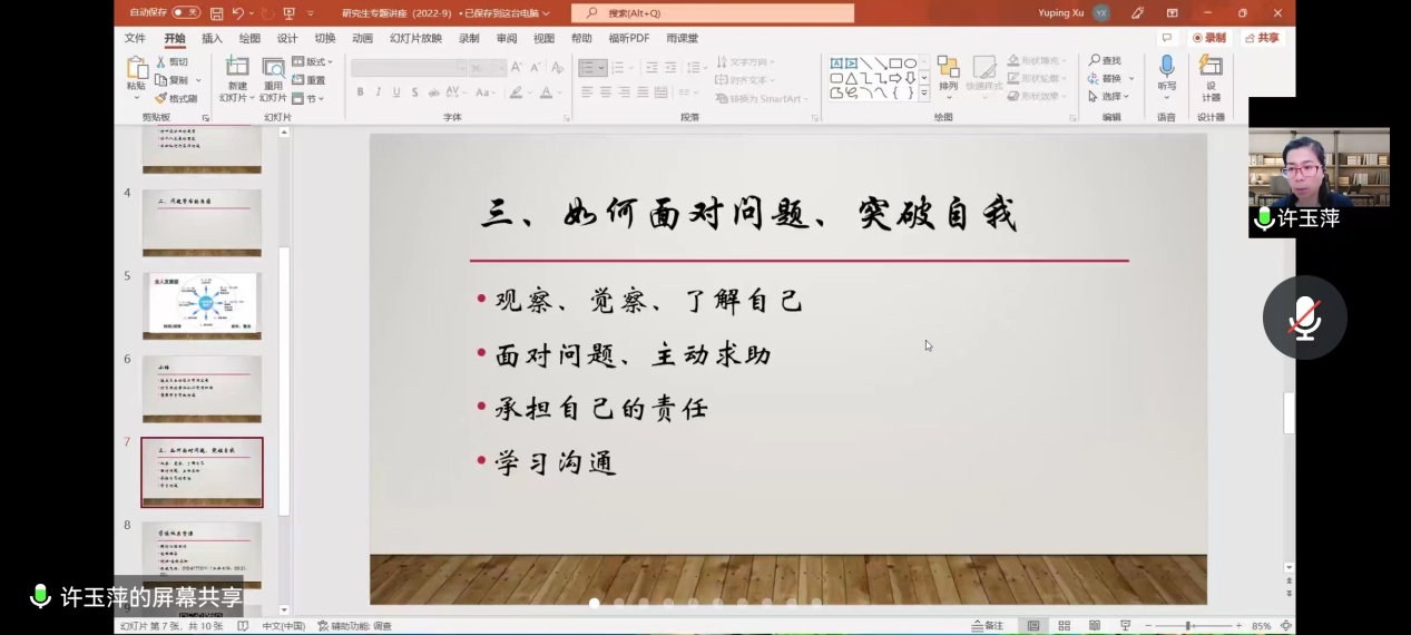 许玉萍从常见的心理问题、了解自己、突破自我等三部分内容入手,准确分析了目前研究生面临的压力点,剖析了个人人生发展的心理历程,强调了梳理自身、认清现实自我的重要性,总结了如何接纳情绪、调整思想的方法。鼓励同学们进行积极的自我探索,引导学生以乐观的心态面对研究生生活。